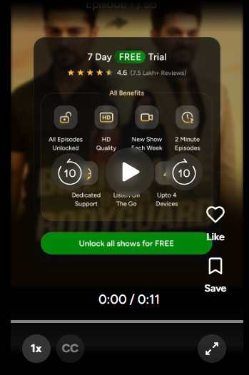 - ट्रायल क्या है? 1₹ में 3-7 दिन प्रीमियम – शुरुआती 21 एपिसोड्स फ्री, आगे सब्सक्रिप्शन (₹499/3 महीने)।